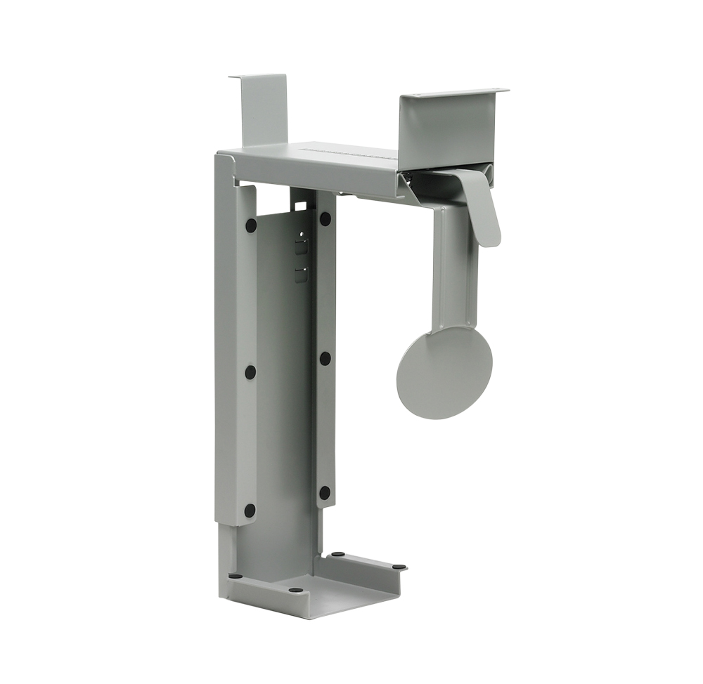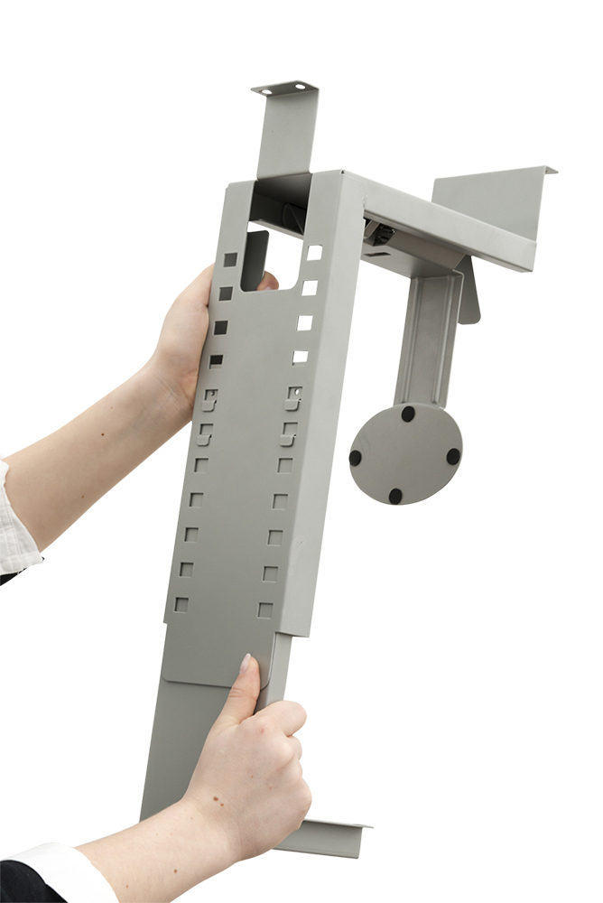 Et solid pc-oppheng som skaper trivsel og ryddighet ved at den stasjonære PC’en monteres under bordet. Man kan enkelt justere bredden ved hjelp av en fjærbelastet pendel. Høyden justeres enkelt ved å plassere den vertikale delen inn i distansehullene på langsiden av opphenget. Enkelt å ta maskinen av og på. Enkel montering med fire skruer i bordplatens underside. For sarger/bordunderstell med høyde opptil 60 mm. Intern test for å illustrere på hvor mye L-form PC-opphenget kan tåle av vekt: